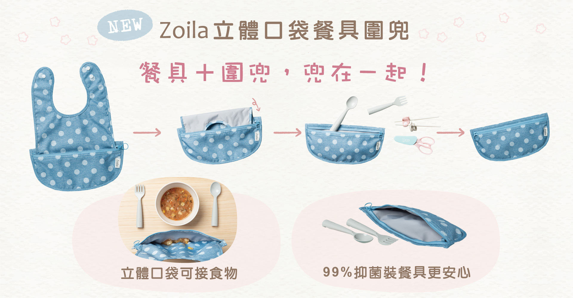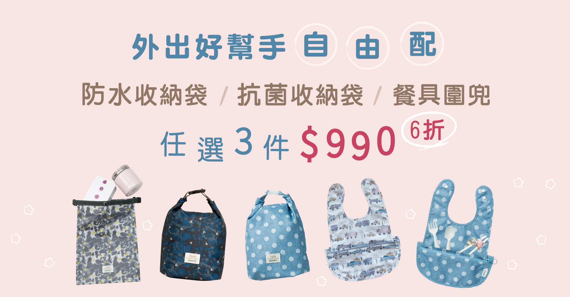 超值組合(55折~67折):防水收納袋/抗菌收納袋/立體口袋餐具圍兜,外出好幫手自由配任選三件$990。