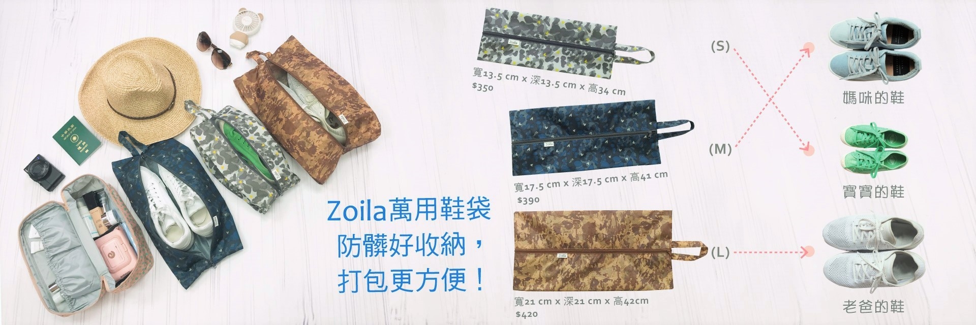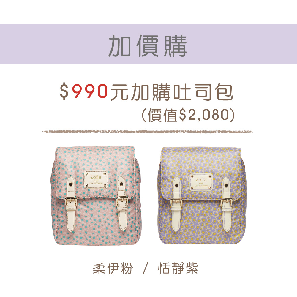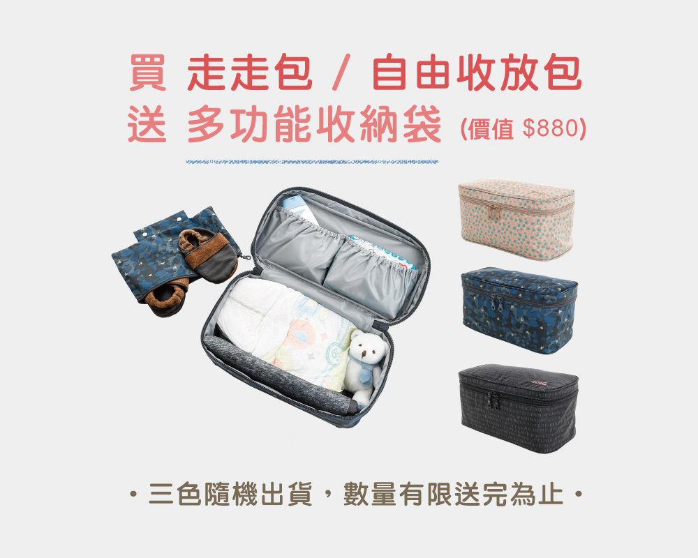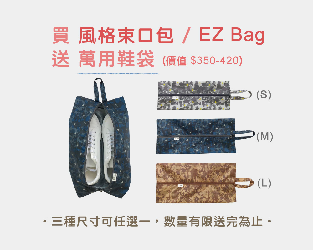 2. 於上述活動期間,在官網、網路通路或實體通路購買 Zoila自由收放後背包及Go Go Bag,「送多功能收納袋」(定價$590); 購買EZ Bag及風格束口後背包,送「萬用鞋袋」。數量有限送完為止,每一筆訂單贈送一個,花色隨機出貨不挑色。