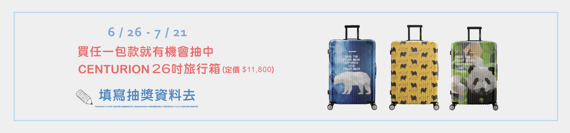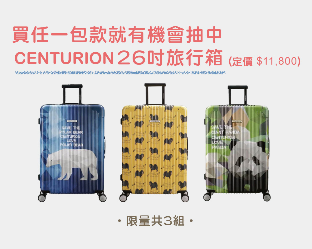 3. 上述活動期間,於 Zoila 官網、博客來、Pinkoi、媽咪愛、Lavida,及實體合作展示店(如以下介紹)購買 Zoila 任一包款,並上網登錄資料,即可參加 Centurion 26 吋旅行箱抽獎(定價 11,800 元,共三名,旅行箱花色隨機出貨不挑款)。每筆訂單僅有一次中獎機會,得獎名單於7/31公布於 Zoila 官網與 Facebook 粉絲專頁,並以電話或電子郵件通知得獎者。得獎者請保留原購買發票作為領獎依據,並請於收到得獎確認信後七日內回覆領獎資料。若得獎者未能於時間內回覆視為喪失得獎資格,原獎項由本公司另行處理。