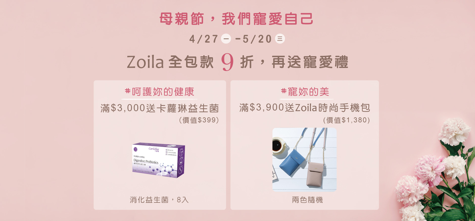 愛自己,就是照顧好自己的身心靈。母親節,Zoila特別挑選國際認證的「卡蘿琳專利益生菌」當作母親節禮物,呵護妳的健康。也為妳挑選出在人生不同階段都可以一路陪著妳的包款,支持妳在「媽媽」與「自己」的多重角色中找到屬於妳的平衡。