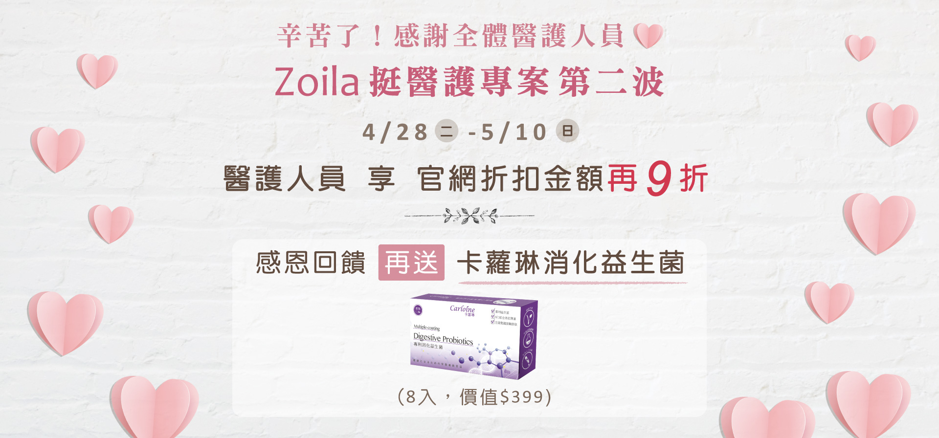 即日起至5/10,出示醫護人員工作證(可拍照傳到粉絲團私訊/官網通訊/Line:@zoila/客服信箱),可享Zoila官網優惠結帳金額再9折,再送「卡蘿琳專利消化益生菌」,照顧別人的同時,也別忘了用滿滿的好菌來照顧自己的健康喔!