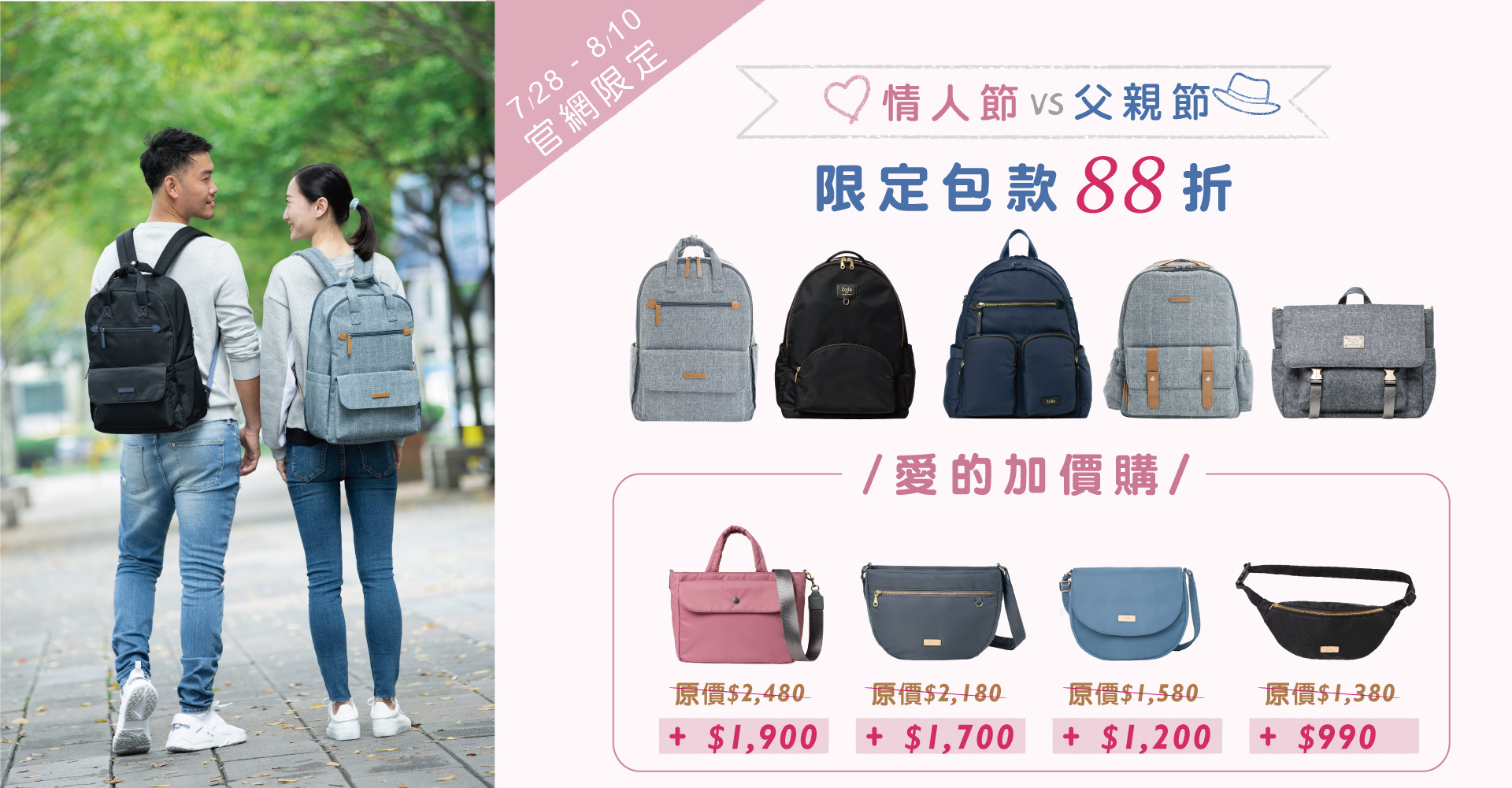 每年的父親節,都會巧遇上七夕情人節,Zoila特別挑選了適合爸爸的後背包,同場加映愛的加價購,用超值優惠價加購適合媽媽的時尚包款,讓你一起搞定父親節+情人節禮物!