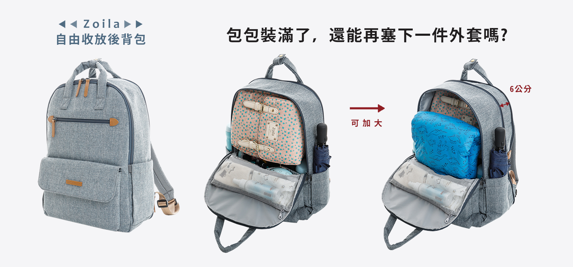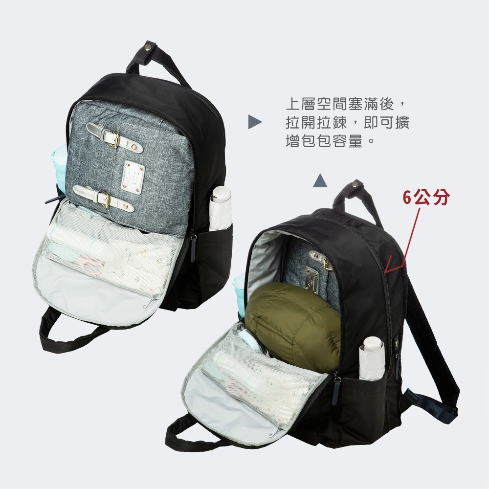 後背包 x 旅行箱加大功能,拉開拉鍊馬上擴增包包容量,旅行時掛在手上的戰利品、帶小孩出門時,從身上脫下來的衣物,不背的包包、不用再大包小包掛手上!拉鍊一拉包包容量馬上變大,手上多出來的物品通通塞進自由收放後背包裡,雙手空出來,行動更自由!
