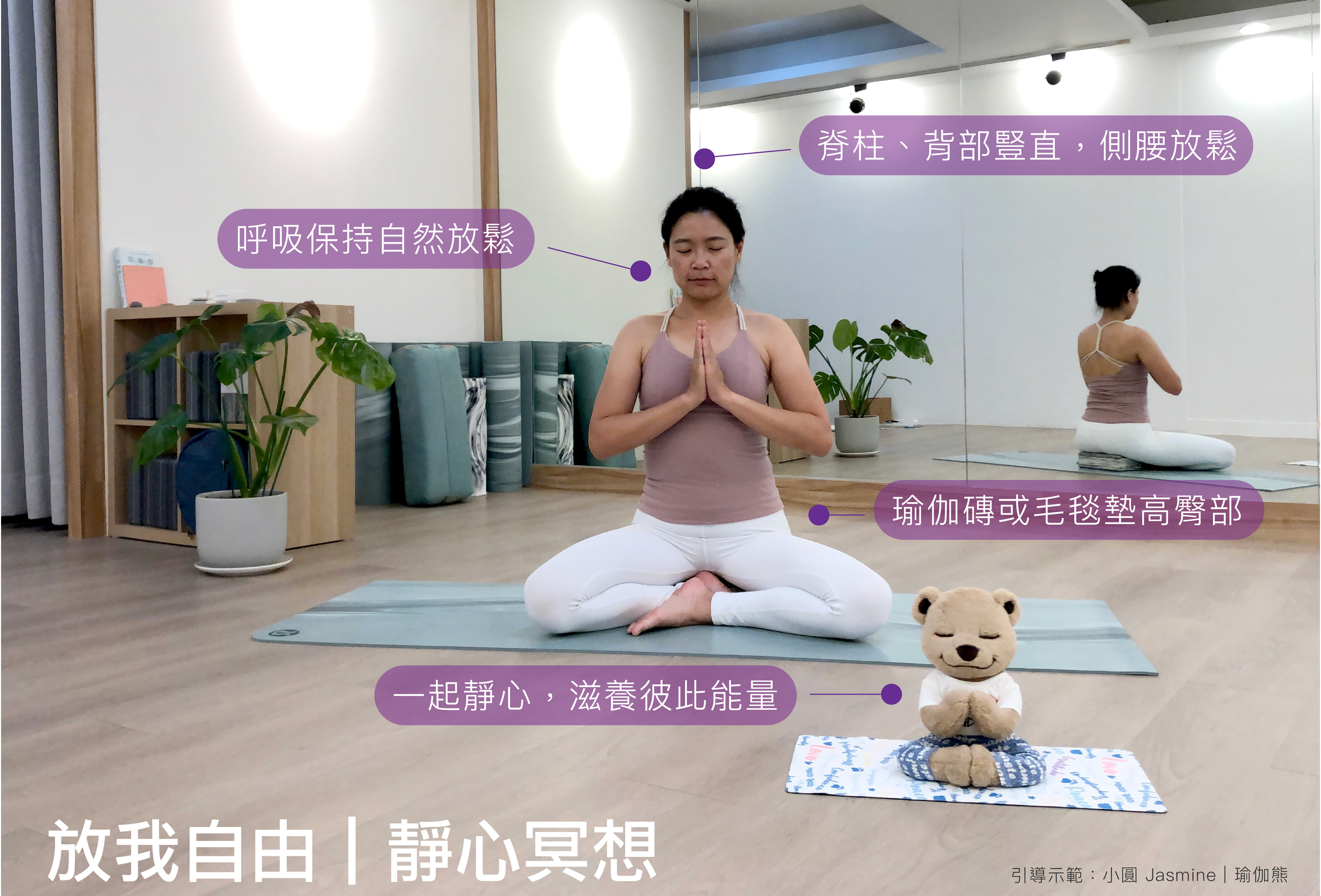 選擇⼀處寧靜⾃在的空間,將身體以舒適坐姿放在瑜珈墊或床上。
