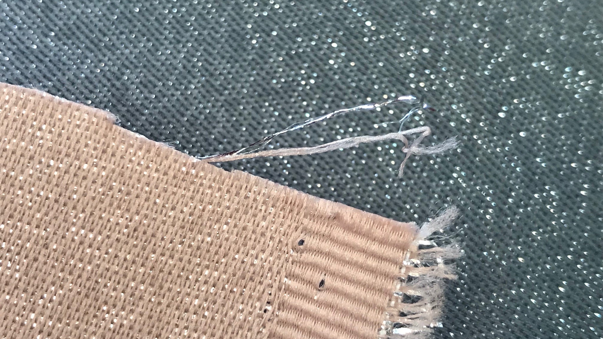 布面在光線下閃耀若隱若現的光芒,就是銀蔥絲的光澤,與一般布料燙上亮粉是不同的,在揉紗程序中就已將銀蔥絲與色紗揉合成為織布的紗線,因此完全不用擔心會掉色。