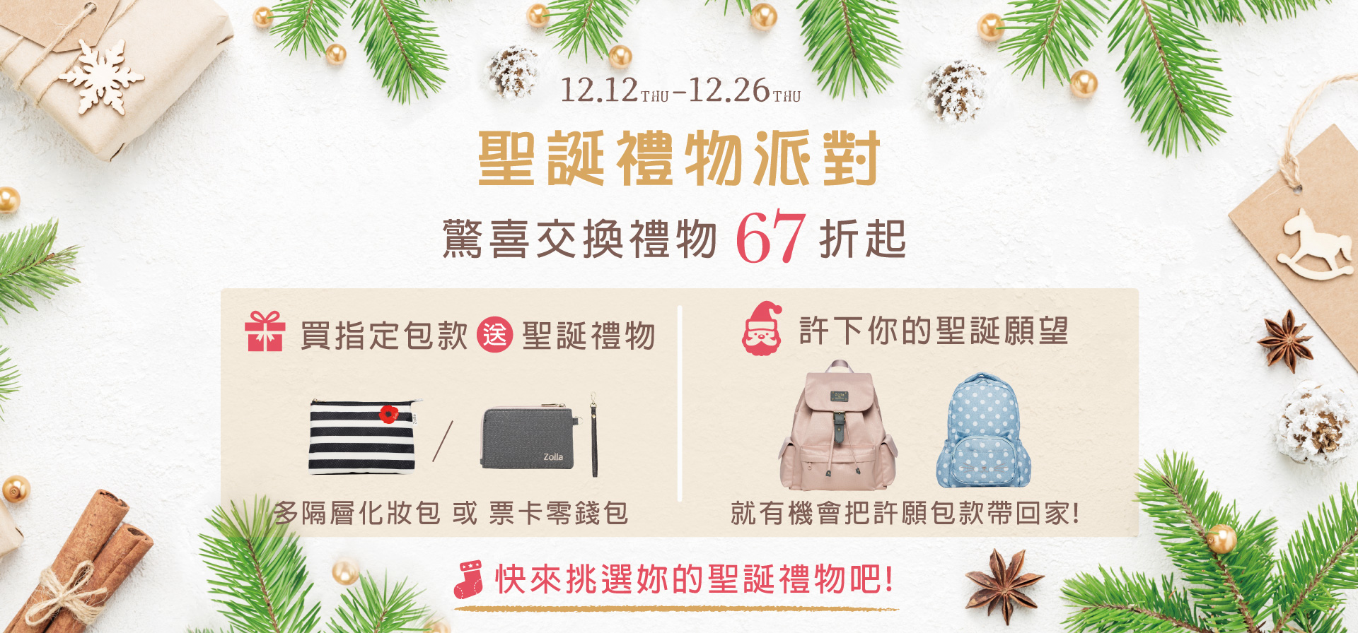 ▪2019/12/12-2019/12/26 於Zoila網路及實體通路購買指定包款(除雙層斜背包及配件外的任何包款),即可獲得Zoila為你準備的聖誕禮物喔!(禮物為多隔層化妝包或票卡零錢包,價值$590)